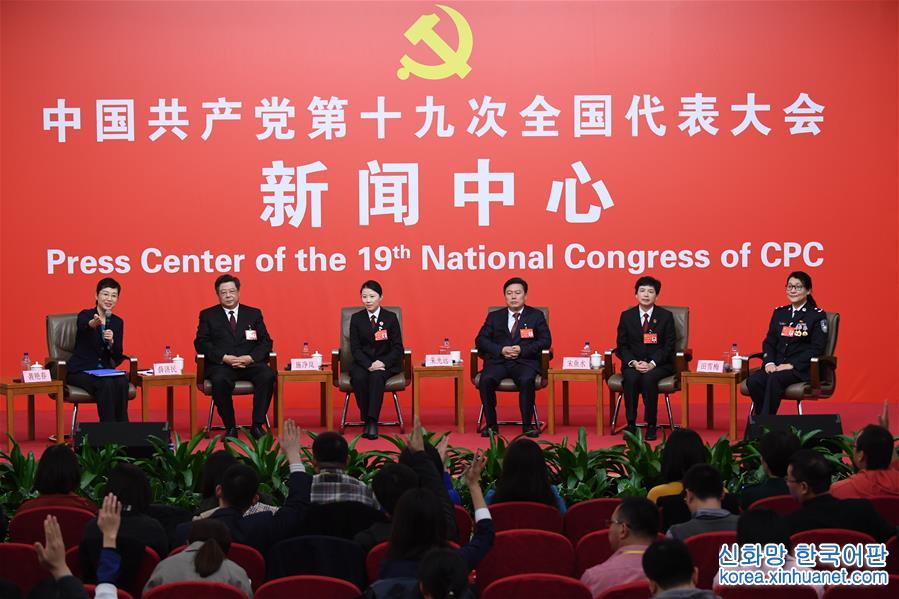 10월 19일, 중국공산당 제19차 전국대표대회 프레스센터에서 '전면적 의법치국 추진'을 주제로 한 단체 인터뷰를 개최했다. 장쑤(江蘇) 쉐지민법률사무소 주임인 쉐지민(薛濟民), 상하이(上海)시 푸둥(浦東)신구 인민검찰원 공소처(2처) 명명검찰관인 스징란(施凈嵐), 장쑤 성위원회, 정법위원회 부서기이며 성 종합관리판공실 주임인 주광위안(朱光遠), 베이징 지적소유권 법원 당조(党組)성원인 쑹위수이(宋鱼水) 부원장, 공안부 물증감정센터 법의(法醫) 병리 손상기술처 부처장(왼쪽 두번째부터 여섯번째)이 인터뷰를 받았다. [촬영/신화사 기자 천예화(陳曄華)]