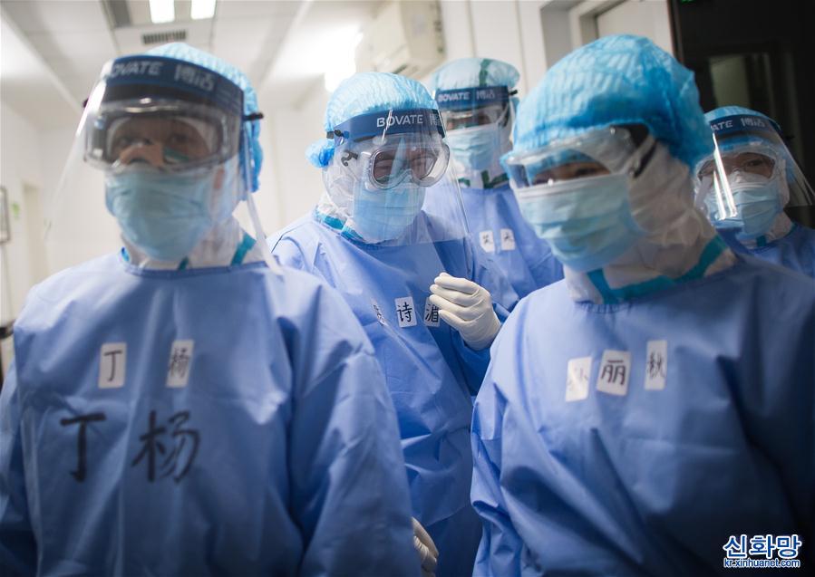 3월 19일, 저장(浙江) 의료팀 대원이 우한시 폐과병원의 중환자실에 들어갈 준비를 하고 있다. 전염병 방역 형세가 계속 호전됨에 따라, 우한시 각 병원이 점차 정상적인 진료 질서를 회복했다. 지금 병원에 입원하고 있는 신종 코로나바이러스 감염증(코로나19) 환자들은 잇따라 우한시 폐과병원 등 10개 지정병원으로 옮겨질 예정이다. 기자가 우한시 폐과병원을 방문해 계속해서 분투하는 의료진의 모습을 카메라에 담았다. [촬영/ 신화사 기자 샤오이주(肖藝九)]